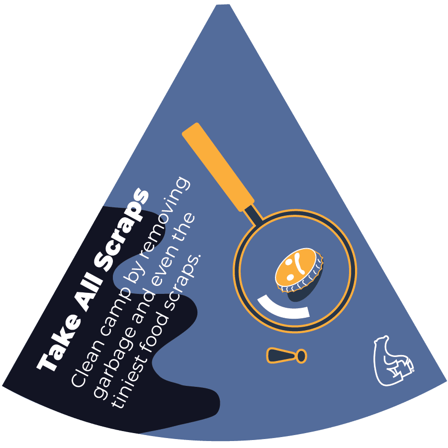 “Empacarlo, empacarlo” es un mantra familiar para los visitantes experimentados de las zonas silvestres. Cualquier usuario de terrenos de recreación tiene la responsabilidad de limpiarlos antes de abandonarlos. Inspeccione su campamento y áreas de descanso en busca de basura o alimentos derramados. Empaque toda la basura y la basura.